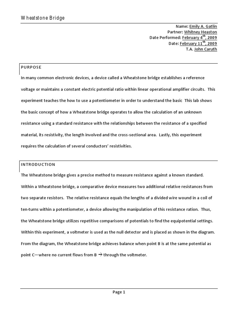John Caruth PURPOS E In many common electronic devices a device called a Wheatstone bridge establishes a reference voltage or maintains a constant electric potential ratio within linear operational amplifier circuits. From your lab section. Analyze your data correctly.